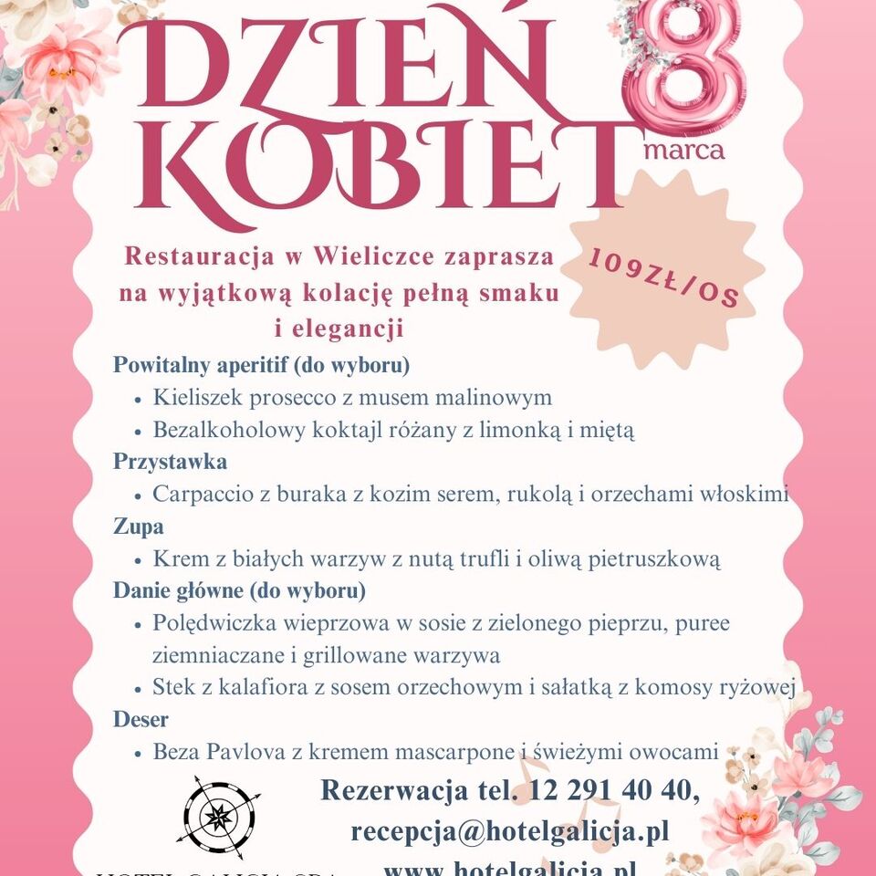 Zapraszamy do restauracji w Wieliczce na elegancką kolację przygotowaną specjalnie na tę okazję. W nastrojowej atmosferze, przy kieliszku prosecco lub aromatycznym koktajlu różanym, rozpoczniemy wieczór pełen smaku i kobiecej delikatności.